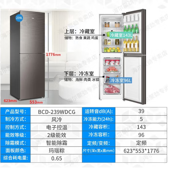 海尔冰箱双开门二门小型家用超薄嵌入式迷你风冷无霜节能静音宿舍办公室239升电冰箱BCD-239WDCG