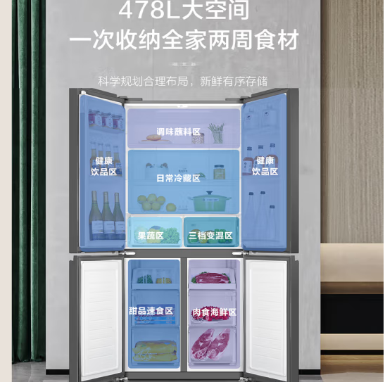 商品品牌:海尔(Haier)冰箱478升大容量十字四开门彩晶玻璃面板变频节能一级能效家用冰箱 BCD-478WGHTDEDSW